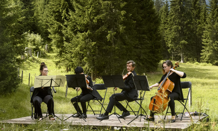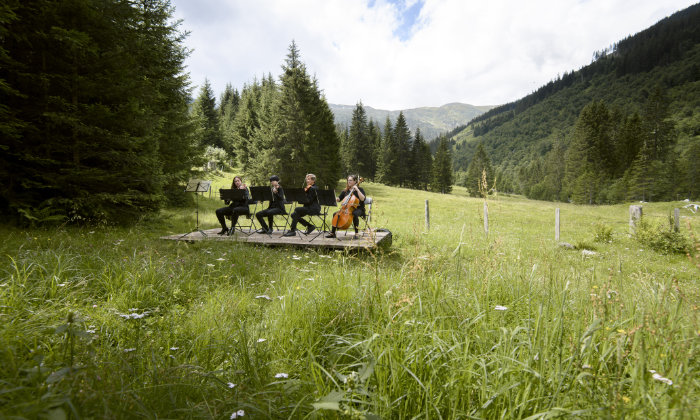"Der Wald legt das Lauschen nahe“, sagte einst Hermann Hesse und so scheint es nur passend, wenn ein kleines Ensemble der Salzburger Philharmonie auszieht, um gemeinsam mit Musikliebhaber:innen Gasteins Wälder zum Klingen zu bringen. Das Klassik-Event findet an unterschiedlichen Plätzen der Natur statt und sorgt für ein einzigartiges Ambiente. Die Bäume spenden angenehmen Schatten, das Grün der Blätter beruhigt die Seele. Alle lauschen gespannt dem Konzert, während rundherum die Atmosphäre des Waldes auf einen wirkt. Es hat etwas Mystisches an sich, wenn im Naturraum Wald musiziert wird.