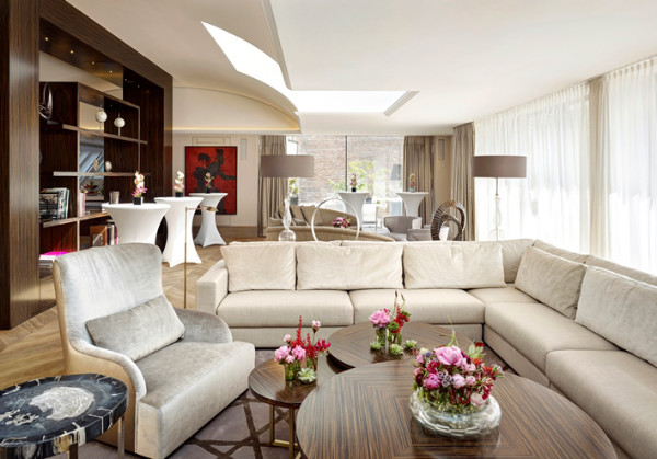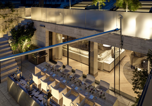 Eine Terrasse mit festem Natursteintisch und Platz für bis zu zehn Personen ist durch eine Schiebeglastür abgetrennt und soll Schutz bei Wind durch verstellbare Lamellen und ein ausfahrbares Sonnensegel bei Sonnenschein bieten. Über eine Naturstein-Treppe gelangt man auf die Dachterrasse der Suite, die mit Loungemöbel und hochgewachsenen Grünpflanzen zum Verweilen einlädt und einen spektakulären Blick über die Stadt ermöglicht, heißt es vom Luxushotel.