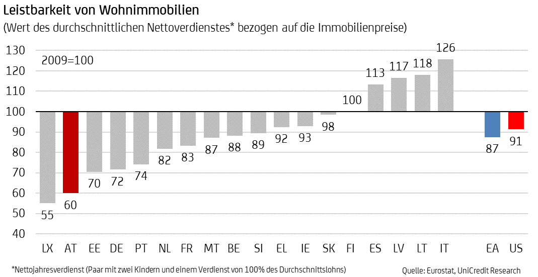 Laut deren Ergebnissen sind die Preise für Wohnimmobilien im Euroraum in den vergangenen Jahren sogar deutlich stärker gestiegen als der durchschnittliche Nettoverdienst. Der reale Wert der Nettoeinkommen bezogen auf die Immobilienpreise sank jährlich um über ein Prozent auf rund 87 Prozent des Jahres 2009. Eine besonders starke Verringerung der Leistbarkeit von Wohnimmobilien seit der Finanzkrise würde sich in Luxemburg und in Österreich zeigen. Der Wert des durchschnittlichen Einkommens bezogen auf die Immobilienpreisentwicklung in Italien, Litauen, Lettland und Spanien habe sich dagegen erhöht, heißt es in einer am Montag veröffentlichten Analyse der UniCredit Bank Austria. Für den Kauf einer 50 Quadratmeter großen Immobilie müssen demnach aktuell durchschnittlich 230.000 Euro aufgewendet werden, 2009 seien es noch 100.000 Euro gewesen.