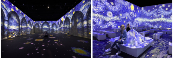 Die multimediale Lichtinstallation bringt die geballte Farbenpracht von Van Goghs Werken zur Geltung und macht Kunst für den Betrachter in einer immersiven Erfahrung greifbarer als je zuvor. In der einmaligen Inszenierung taucht der Besucher in die Werke Van Goghs ein und erlebt die virtuelle Illusion als Realität. Die Gemälde werden mit Hilfe von übergroßen Projektionen und Videoanimationen in Kombination mit gefühlvollen Melodien spürbar zum Leben erweckt. So bleibt dem Besucher kein Detail der berühmten Kunstwerke verborgen. Van Goghs Werke wie die weltberühmten "Sonnenblumen", "Das Nachtcafé", die "Sternennacht", "Die Kartoffelesser" oder das "Schlafzimmer in Arles" werden aus einer ganz neuen Perspektive erlebbar. Der Betrachter befindet sich inmitten der Gemälde, er wird Teil der Szenerie, versinkt in Licht und Ton, die Kunstwerke interagieren mit ihm.