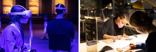 VR-Erlebnis für Besucher:innen (links). Besucher:innen können selbst zu Künstler:innen werden © Dominik Gruss