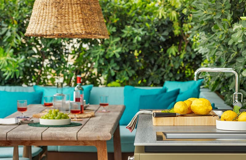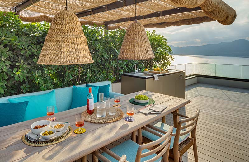 Erfrischende Abkühlung im kalten Wasser, lesen auf der Sonnenliege und unberührte Natur – der Gemeinschaftsgarten mit Infinity Pool lädt die Bewohner:innen der "Villa Maya" zum Entschleunigen und Auftanken ein. Die nach Kundenwünschen gebaute Rooftop Outdoor Küche von Klumaier x Tanner lässt das BBQ-Herz höherschlagen und wartet nur darauf, an warmen Sonnentagen für das Zubereiten von mediterranen Köstlichkeiten und Aperol Spritz genutzt zu werden.