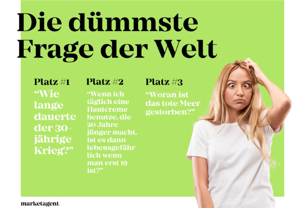 "Es gibt keine dummen Frage", heißt es. Das Online Research Instituts Marketagent wollte jedoch im Rahmen eines Contests das Gegenteil beweisen. Gemeinsam mit ihrer Meinungsbildner-Community haben sich die Marktforscher:innen aus Baden diesen Sommer auf die Suche nach der dümmsten Frage der Welt begeben. Die beste bzw. in diesem Fall dümmste Frage wurde anschließend in einem demokratischen Publikumsvoting gekürt.