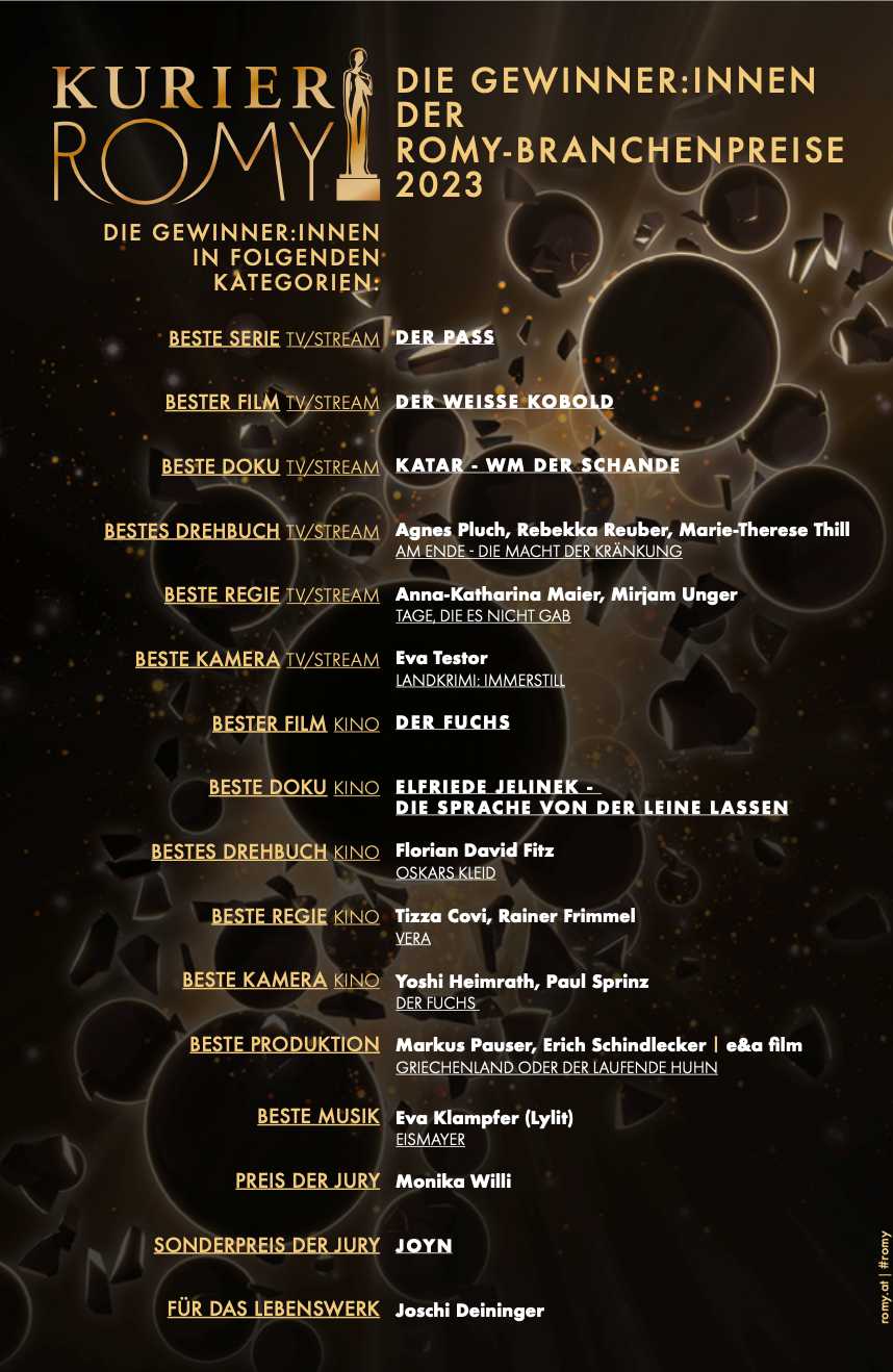 An einen ganz besonderen Preisträger ging die vom Kurier vergebene Platin-Romy: Josef "Joschi" Deininger. Er habe sich in der heimischen Filmbranche bewegt wie kein anderer , heißt es von der Jury. "Deininger ist als Chauffeur der Stars, der Schauspieler:innen undzu den Drehs und wieder zurück kutschiert, zu einer der zentralen Figuren der gesamten Branche geworden: Als Beichtvater, Ansprechpartner, zentrale Anlaufstelle für Branchentratsch und enge Bezugsperson für viele Darsteller:innen."