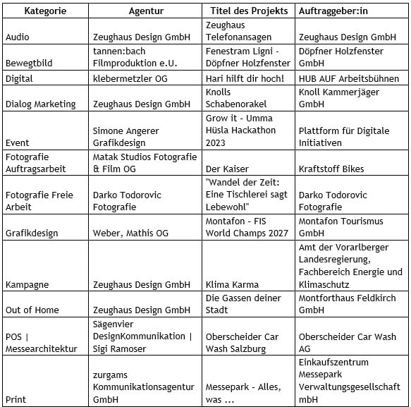 Großer Abräumer war heuer die Agentur Zeughaus, die gleich in vier Kategorien gewann: Audio, Dialog Marketing, Kampagne und Out of Home. tannen:bach Filmproduktion überzeugte in der Kategorie Bewegtbild, klebermetzler OG, ein Vorarlberger Team, das von Wien aus agiert, errang den Preis in der Kategorie Digital. Grafikdesignerin Simone Angerer siegte in der Kategorie Event, Weber, Mathis OG im Grafikdesign.