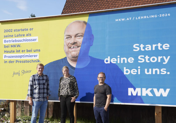 Auch die MKW Holding GmbH mit Sitz in Oberösterreich setzt aktuell auf Plakatwerbung bei der Suche nach Lehrlingen. Eine Kampagne unter der Federführung der Kreativ-Agentur Werbe ID zeigt die Porträts echter Mitarbeiter:innen, die einmal als Lehrling im Unternehmen begonnen haben. Die individuellen Karrierewege werden kurz dargestellt, eine Unterschrift der abgebildeten Person sorgt für noch mehr Authentizität. Ergänzt wird das Sujet mit dem Claim "Starte deine Story bei uns", der Interessent:innen dazu auffordert, ihre berufliche Karriere bei MKW zu beginnen.