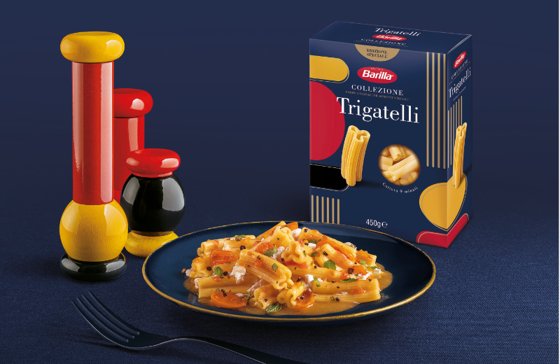 Mit der neuen Pasta-Form "Trigatelli" zollt Barilla dem italienischen Alessi-Design Tribut. Das italienische Designhaus ist bekannt dafür, Haushaltsgegenstände mit hohem Wiedererkennungswert zu entwerfen. Barilla verfolgt mit der Collezione-Serie ein ähnliches Ziel: Mit innovativen Pasta-Formen will man kulinarisch für Abwechslung sorgen und herausstechen. Das "Tri" im Namen steht für die kleeblattartige Silhouette. In Kombination mit ihrer "al dente"-Textur sollen Saucen besonders gut haften.