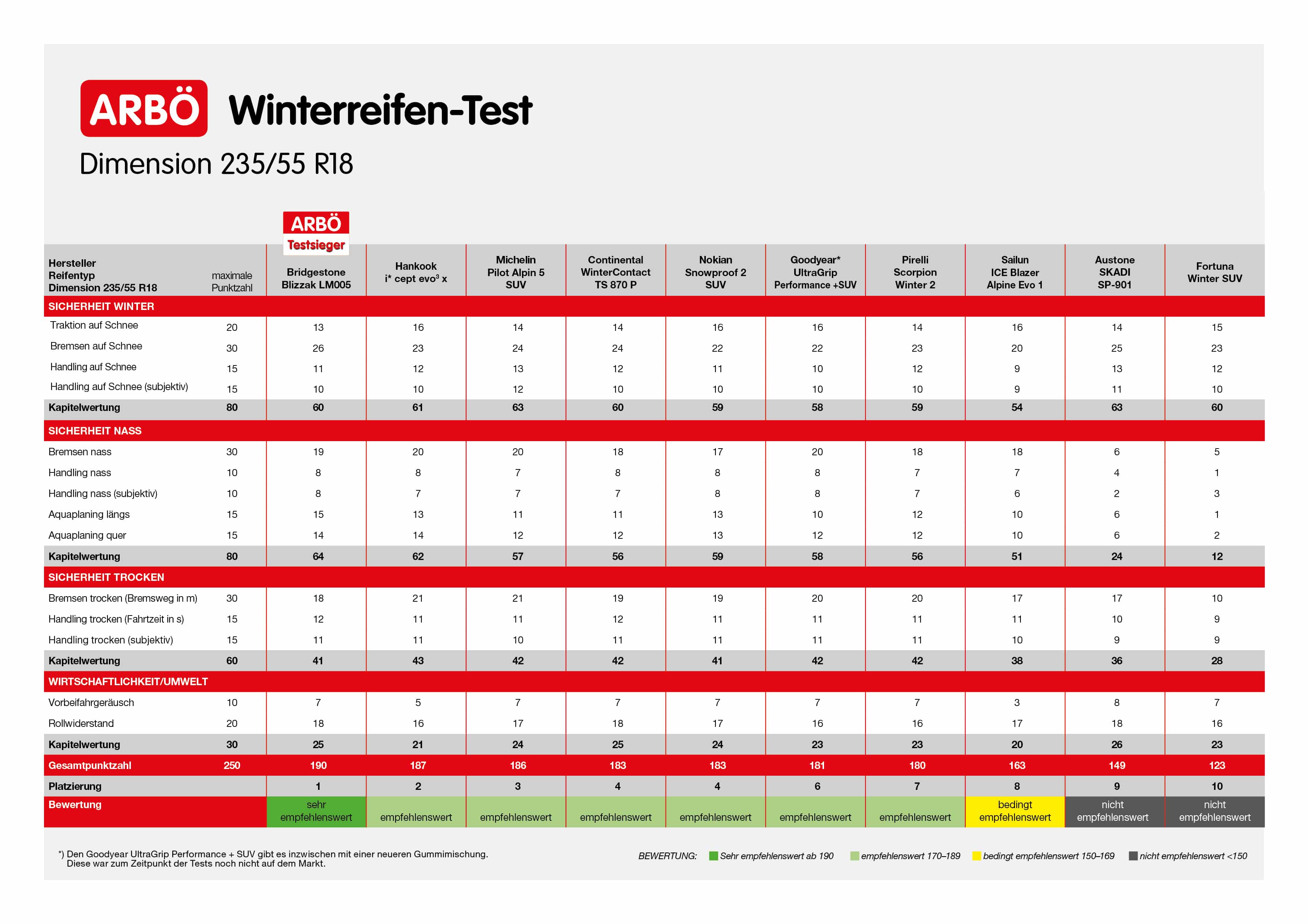 Fazit der Mobilitätsclubs: Der Bridgestone sei nah am perfekten Winterreifen dran, er zeige in allen Disziplinen mehr als ein grundsolides Gesamtbild, dicht gefolgt vom Hankook und Continental. Der Austone und der Fortuna hätten komplett enttäuscht, wie Erich Groiss, technischer Koordiantor des ARBÖ ausführt: "Nach einem starken Start auf Schnee zeigten sie, wie gefährlich es sein kann, bei Wetterwechsel den falschen Reifen zu haben. Sie fallen unter den gegebenen Bedingungen komplett durch den Test. Von diesen Reifen raten wir eindringlich ab."