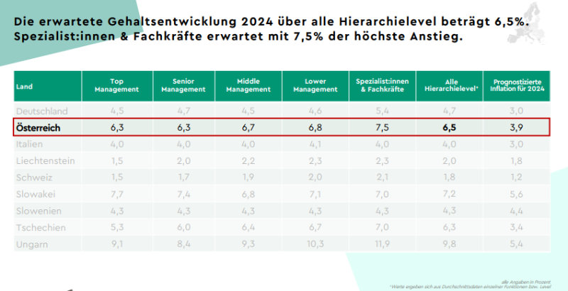 Die erwartete Gehaltsentwicklung 2024 über alle Hierarchielevel beträgt 6,5 Prozent. Spezialistinnen & Fachkräfte erwartet mit 7,5 Prozent der höchste Anstieg. © Kienbaum Wien