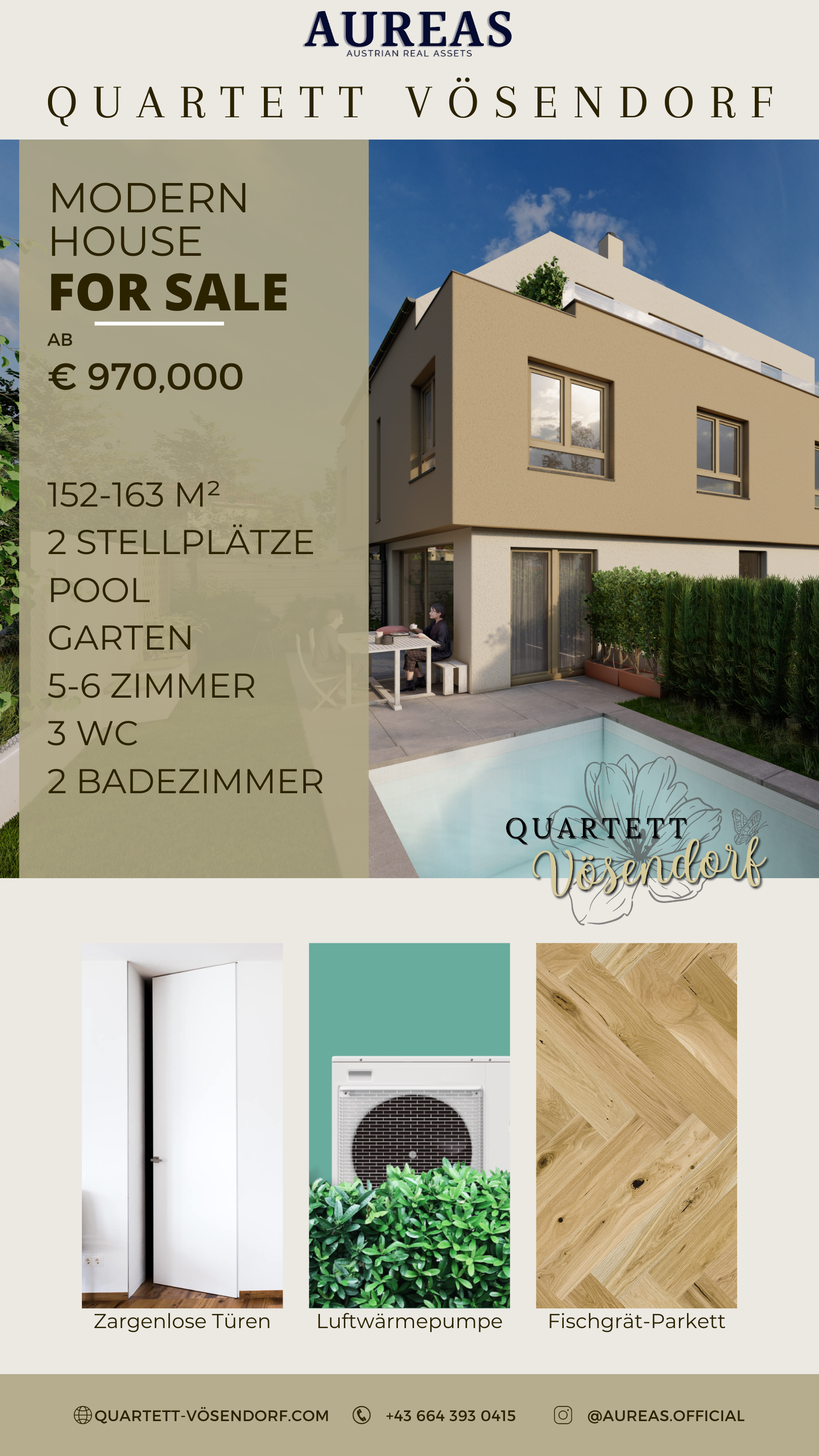 Das Quartett Vösendorf ist weit mehr als nur ein Wohnprojekt – modernes Wohnen, kombiniert mit erstklassiger Ausstattung in idealer Vorstadtlage - urbanes Lebensgefühl trifft Naturverbundenheit. Mit nur 4 exklusiven Einheiten, jede mit einem eigenen Pool und zwei Parkplätzen, genießen Sie hier eine unvergleichliche Privatsphäre und den Raum für die Familie, den Sie sich wünschen. Die Einheiten sind durchgehend schalltechnisch getrennt und im Garten bietet eine doppelschalige Lärchenwand Sichtschutz und Intimität.
