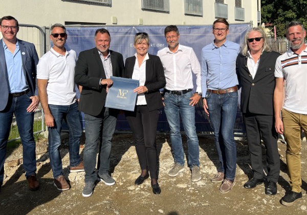 V.l.n.r.: Michael Derler, Geschäftsführer MD Baumangement GmbH, Dimitrios Akranidis, Projektleiter, Horst Lukaseder, Mitglied der Geschäftsführung, beide VMF Immobilien GmbH, Doris Enzensberger-Gasser, Geschäftsführende Gesellschafterin, Engelbert Gräber, Prokurist & Oberbauleiter, Christian Oschmalz, Bauleiter, alle Lieb Bau Weiz GmbH, Knud Christian Nielsen, Begleitende Kontrolle für die VR-Bank, Georg Schwillinsky, Architekt, Plangemäß GmbH bei der Gleichenfeier. © VMF Immobilien GmbH