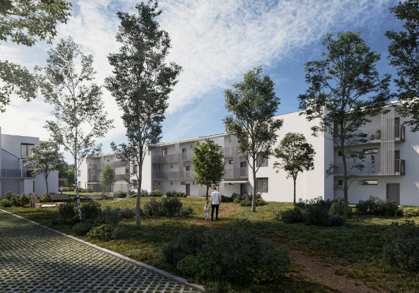 Auf einem 5.982 Quadratmeter großen und langgestreckten Baugrund entstehen fünf Wohngebäude mit 43 Wohnungen zwischen 39 und 77 Quadratmetern. Alle Wohneinheiten verfügen über Freiflächen wie Terrassen, Loggien, Balkone oder Eigengärten mit Südorientierung.