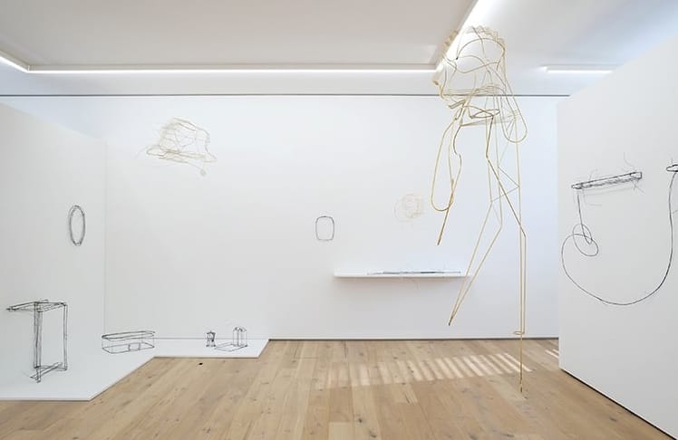 Der Draht windet sich um sich selbst, verwandelt sich in gekräuselte Linien und filigrane Schrauben. Gelegentlich verästelt er sich und franst aus, die nackten Enden bleiben sichtbar – ein Hinweis auf die Täuschung. Fritz Panzer (*1945) denkt die Dinge von ihren Konturen her. Seine Skulpturen verdanken sich Zeichnungen, die durch Drahtgebilde räumlich werden. Panzer formt die äusseren Umrisse nach, lässt die Substanz, das Innere, den Kern und sogar die äussere Hülle der Dinge ausser Acht. Für diese Ausstellung beschränkt er sich auf schwarzen Draht. Die Objekte wirken wie Zeichnungen, die sich wie Frottagen ihrer Aussenkanten zu erkennen geben. Ma nches an diesen Konstruktionen erinnert an gebastelte Platzhalter, anderes an lebensgrosse Attrappen, die den Versuch unternehmen, die Einfachheit der Dinge wiederzugeben. Zuweilen wirken sie wie Dummies, die über den Umgang mit der Leere sinnieren lassen, einem Dasein in der Gegenwart des Nichts.