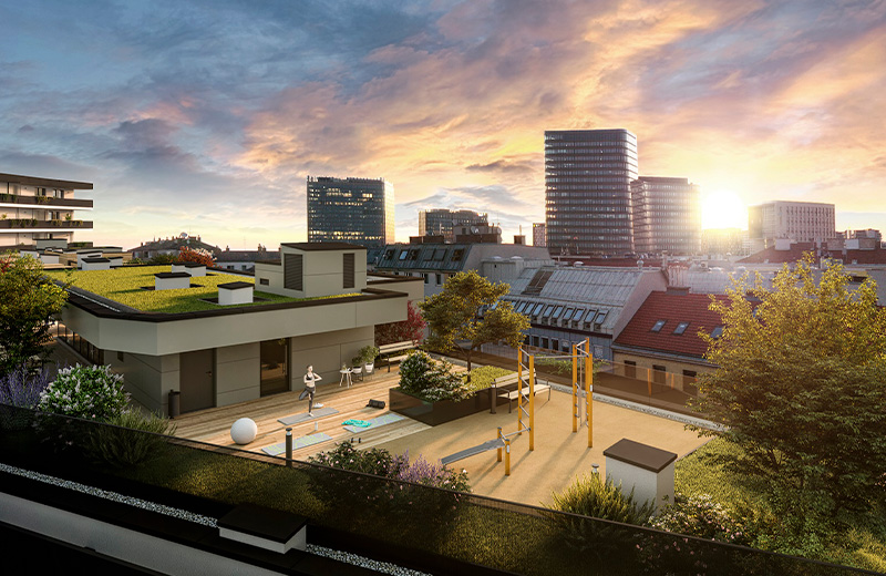 Alle Wohnungen sind mit Freiflächen ausgestattet, besonderes Highlight ist aber die Dachterrasse des 11-geschossigen Projekts: Dort genießen die künftigen Bewohner:innen nicht nur einen beeindruckenden Rundumblick über die Stadt, sondern haben zudem die Möglichkeit, Urban-Gardening-Flächen zu nutzen, in der offenen Küche BBQ-Feste mit Nachbarn, Familie und Freunden zu feiern oder im eigens eingerichtetem Yoga-Bereich zu entspannen.