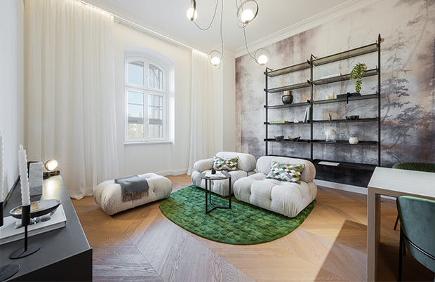 Als Musterwohnung wurde das rund 78m² große Apartment im Bestandsgebäude gewählt. Die Besonderheiten der historischen Bausubstanz, wie die bis zu 3,5m hohen Räume oder die ikonisch abgerundeten Fenster, wurden in das Konzept des Wohndesigns eingebunden und durch liebevolle Details, wie aufwändige Stuckaturen oder in die Decke eingelassene Akzentbeleuchtungen ergänzt. In Kombination mit farblich abgestimmten Möbeln und einer maßgefertigten Küchenzeile, kann ein perfekter Eindruck gewonnen werden, wie es sich im ARTMANN wohnen wird.