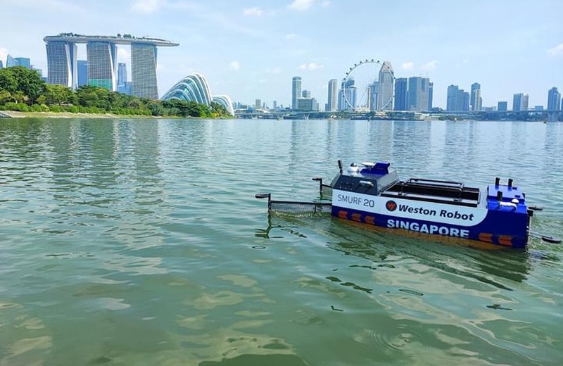 In Marina Bay, einem zentralen Bereich von Singapur, der von berühmten Wahrzeichen der Stadt umgeben und ein Zentrum für Geschäfts- und Wohnaktivitäten ist, kreuzen jetzt schwimmende autonome Reinigungsroboter. Sie stehen über den schnellen Mobilfunkstandard 5G in Kontakt mit der Zentrale. Dieses Netz, das den Stadtstaat bereits zu etwa 95 Prozent abdeckt, soll für optimales Funktionieren sorgen. Bei dem Projekt hat die Infocomm Media Development Authority des Ministeriums für Kommunikation und Information mit Weston Robot kooperiert.