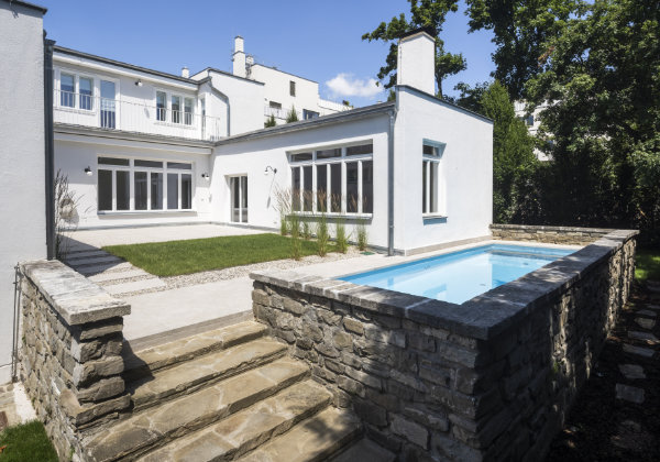 Aus dem Obergeschoß der revitalisierten Villa Bunzl wurde ein privater Rückzugsort und im Souterrain ein Sauna-/Ruhebereich vorgesehen. Das zu temperierende und mit einer Gegenstromanlage ausgestattete Schwimmbecken wurde zwischen den historischen Gartenmauern platziert. Um das Gießen des grünen Gartens kümmert sich die elektronisch gesteuerte Bewässerungsanlage.