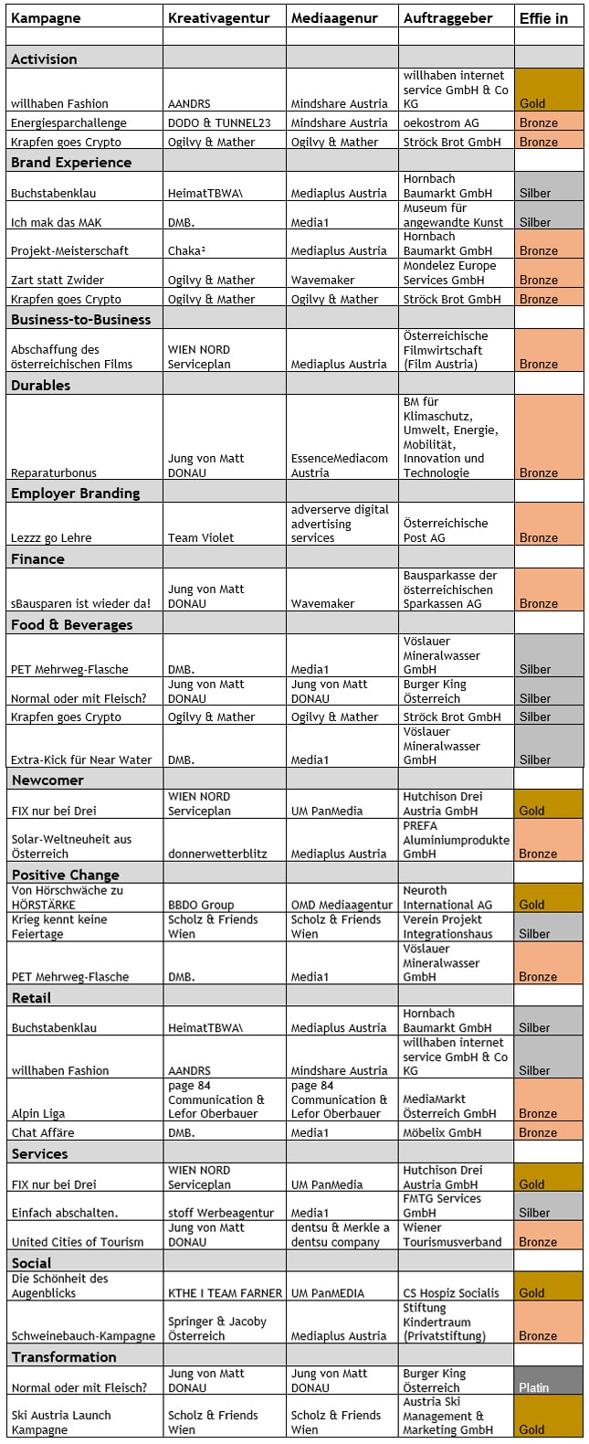 Neben der haptischen Effie-Trophäe gab es auch eine eigene KI-interpretierte Auszeichnung. Zudem wurde der IAA Audience Award verliehen sowie der neue IAA Marketer des Jahres gekürt. Als Hauptsponsoren fungierten erneut ORF-Enterprise und IP Österreich. Kathi Wörndl (RTL2) und Philipp Hansa (Ö3) führten durch die ausverkaufte Verleihung.