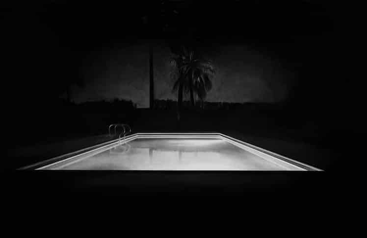 Auch die Nacht hat ähnliche Qualitäten, sie ist der mystische Teil des Tages, in dem die Energien zum Schweigen gebracht werden, eine Zeit der Träume und Fantasien, der Ruhe und der Meditation. Das ist genau die Tageszeit, in der Peter Mirkovic zeichnet und in der alle diese Zeichnungen entstanden sind. Poollandschaften neben Wohnwagen – einsam, menschenleer, hell erleuchtet: mystisch eben!