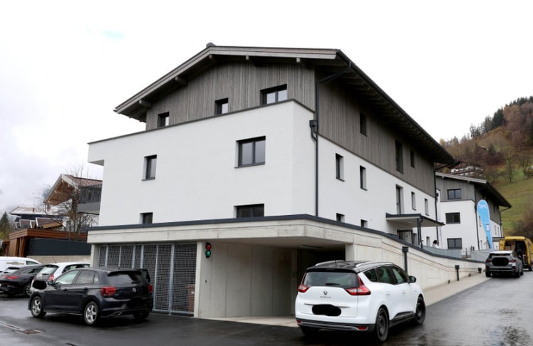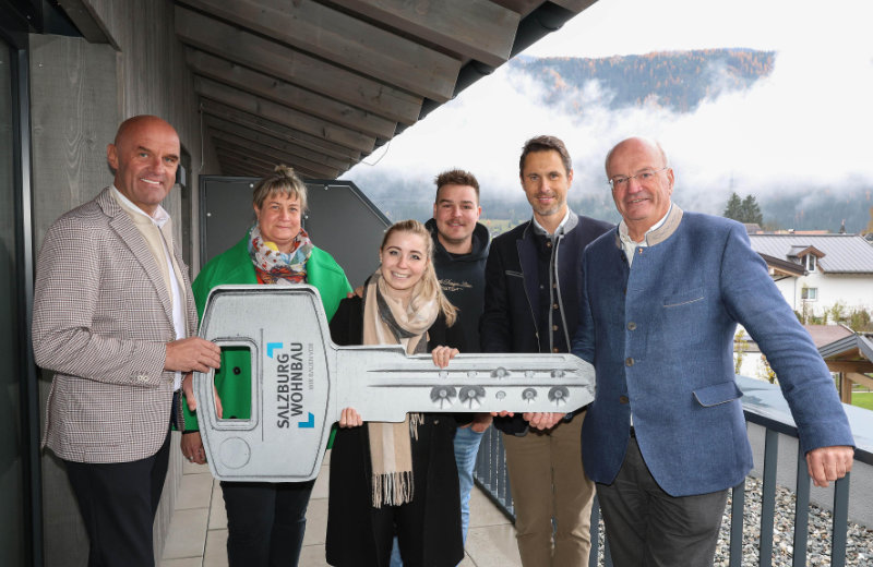 V.l.n.r.: Bürgermeister Hannes Enzinger, Johanna Heuser, Bundesforste, Sarah Ettl, Bewohnerin, Franz Schößer, Bewohner, Georg Grundbichler, GF Salzburg Wohnbau und Christian Struber, GF Salzburg Wohnbau © Neumayr