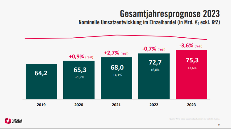 Der Jahresumsatz 2023 soll sich auf 75,3 Milliarden Euro belaufen. "Aus all diesen Faktoren leitet sich unsere Gesamtjahresprognose 2023 für den österreichischen Einzelhandel von 75,3 Milliarden Euro netto ab", sagt Will. Das ist eine nominelle Steigerung von 3,6 Prozent gegenüber 2022. "Bereinigt man allerdings um die durchschnittlichen Preissteigerungen im Gesamtjahr, muss der heimische Einzelhandel heuer real ein Umsatzminus von -3,6 Prozent verkraften", so der Handelssprecher.