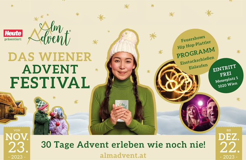 Das Alm Advent Festival lädt seit 23. November bis 22. Dezember 2023 am Messeplatz im zweiten Wiener Gemeindebezirk zu 30 Tagen stimmungsvolles und abwechslungsreiches Programm in der Vorweihnachtszeit, natürlich bei freiem Eintritt!