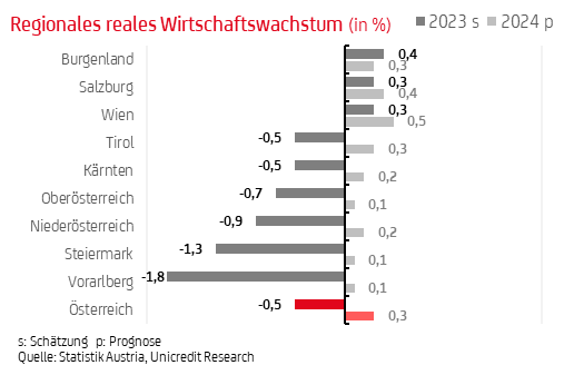 Für 2024 erwarten die Ökonomen den Beginn einer moderaten Erholung in Österreich mit einem leichten BIP-Anstieg in Österreich von 0,3 Prozent basierend auf einen weiteren Rückgang der Inflation. "Aufgrund einer weiterhin robusten Nachfrage im Tourismus und dank steigender Reallöhne höherem Konsum werden auch 2024 die dienstleistungsorientierten Bundesländer wie Wien und Salzburg gegen über den Industriebundesländern wie die Steiermark und Oberösterreich bevorzugt sein", sagt Schwarz.