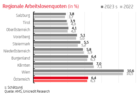 Nachdem sich der Arbeitsmarkt in den Bundesländern 2023 sehr robust gezeigt hat, rechnen die Experten der UniCredit Bank Austria für 2024 mit einem Anstieg der Arbeitslosenquote in Österreich auf durchschnittlich 6,7 Prozent nach 6,4 Prozent 2023. Die Arbeitslosigkeit werde voraussichtlich in allen Bundesländern steigen mit einem überdurchschnittlichen Anstieg in den Bundesländern mit hohem Industrieanteil.