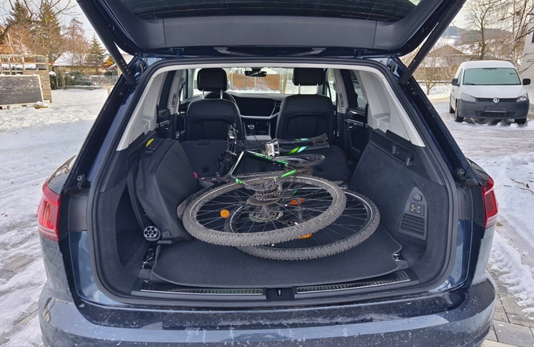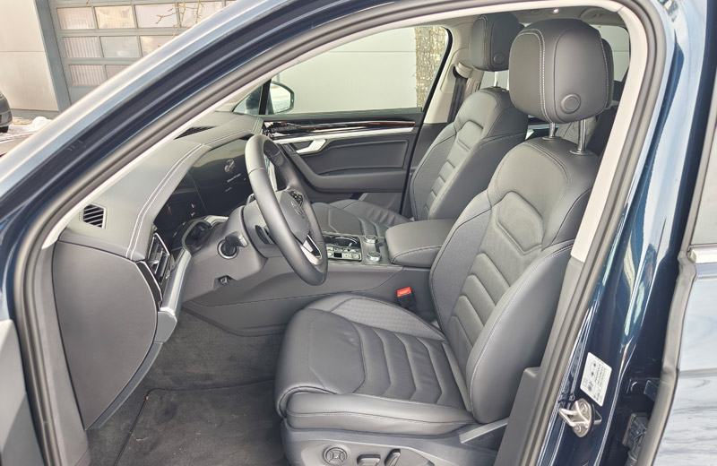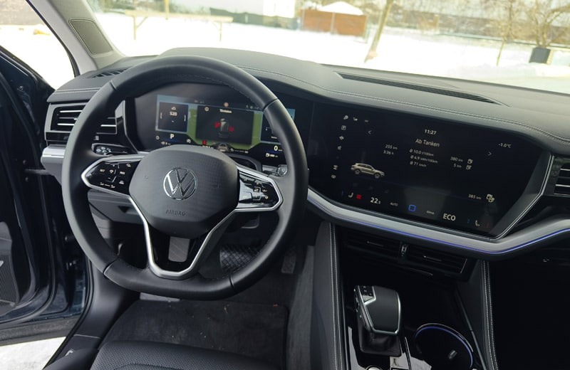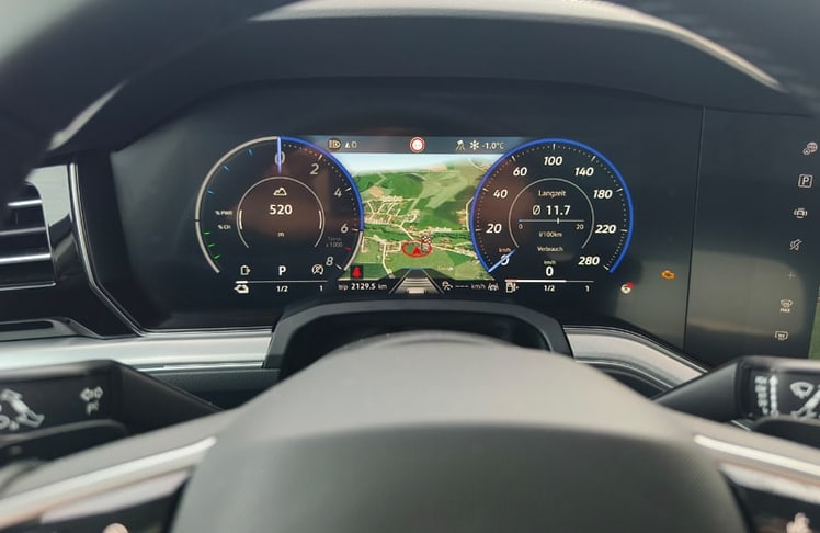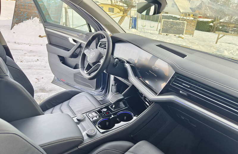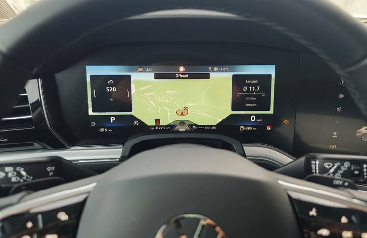 Im Innenraum wurden die verwendeten Materialien noch einmal aufgewertet und werden nun dem Preis voll und ganz gerecht. Gleiches gilt für die Cockpit-Gestaltung, bei der VW an der integrierten Touchscreen-Lösung festhält und nicht auf eine (günstigere) hochgestellte Variante zurückgreift. So wirkt das Design harmonisch und flüssig. Serienmäßig ist das so genannte "Innovision Cockpit" an Bord, das sich aus digitalen Instrumenten mit 30,5 cm Diagonale und dem 38,1 cm großen Touchscreen zusammensetzt. Auch hier wurde technisch nachgelegt. So arbeitet die Navigation präziser und ist mit hochauflösenden Kartendaten ausgestattet. Weiters haben die Ingenieure die Sprachbedienung des Touareg, die mit "Hey Volkswagen" oder am Lenkrad aktiviert wird, weiterentwickelt. Sie funktioniert nun deutlich besser, reicht aber nicht ganz an das Niveau von Mercedes oder BMW heran. Da VW beim Lenkrad nach wie vor an den Sensortasten festhält, was der Bedienfreundlichkeit nicht unbedingt zugute kommt, ist es besonders wichtig, dass die Sprachbedienung und jene via Touchscreen ordentlich funktionieren. Beim Facelift des Golf 8, das in Kürze vorgestellt wird, hat VW auf die (berechtigte) Kritik bereits reagiert und setzt hier wieder auf ein Lenkrad mit festen Tasten. Dem Touareg muss man zugutehalten, dass er noch über echte Tasten und Drehräder in der Mittelkonsole verfügt. Hervorzuheben sind hier u.a. die massive Drehwalze für die Lautstärkeregelung sowie die Drehräder für Fahrwerk, Fahrprofile und Allradeinstellungen. Ein weiterer Fortschritt ist, dass Apple CarPlay unbd Android Auto nun auch kabellos gekoppelt werden können. Eine induktive Ladeschale für Smartphones ist in dieser Klasse ohnehin längst state of the art. Neugestaltet und mit dem Schriftzug "Touareg" versehen wurden die durchleuchteten Dekore in der Instrumententafel, was für einen edlen Look sorgt. Die Sitze und das Platzangebot sind vorne wie hinten absolut langstreckentauglich. Zudem ist der Kofferraum trotz Akku darunter noch so dimensioniert, dass er auch das Urlaubsgepäck locker aufnimmt. Unser Testwagen war vorne und hinten mit Sitzheizung und mit einer Lenkradheizung ausgestattet, was sich an kalten Tagen als echter Segen erweist.
