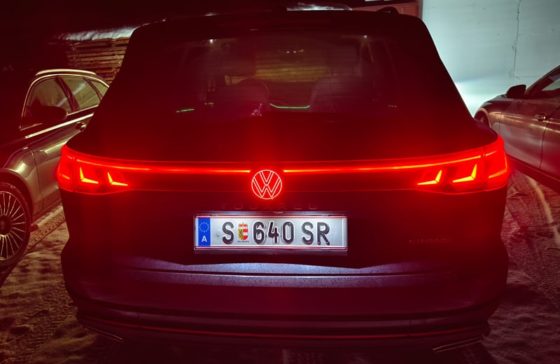 Optisch ist der "neue" Touareg u.a. am geänderten Kühlergrill inklusive beleuchteter Querspange, der neu designten Frontschürze und den schmäleren Scheinwerfern erkennbar. Unser Testmodell in "Elegance"-Ausstattung hatte die so genannten "IQ.Light – HD-Matrixscheinwerfer" an Bord. Diese sorgen mit ihren drei Lichtmodulen pro Seite für einen markanten Blick. Highlight ist jedoch deren Technik - mehr als 38.000 Multipixel-LEDs sorgen dafür, dass die Nacht quasi zum Tag wird. Im Test funktionierte die automatische Ausleuchtung der Fahrspur und Ausblendung des Gegenverkehrs hervorragend und fehlerfrei. Am Heck setzen sich die Lichtspiele fort. Hat man sich für die Hightech-Scheinwerfer entschieden, gibt es auch bei den Rückleuchten eine durchgängige LED-Querspange – und als echten Hingucker ein rot beleuchtetes VW-Logo. Ansonsten beschränken sich die optischen Änderungen auf neue Felgendesigns und Außenfarben.