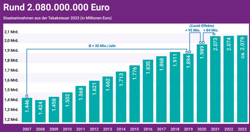 Am Donnerstag hat JTI Austria einige Daten zum Tabakmarkt des vergangenen Jahres veröffentlicht. Dabei zeigt sich, dass der Staat nach wie vor gut an den Raucher:innen verdient. Laut dem Tabakkonzern hat das Finanzministerium 2023 fast 2,1 Milliarden Euro aus der Tabaksteuer eingenommen. Inklusive Mehrwertsteuer waren es sogar 2,7 Milliarden Euro.