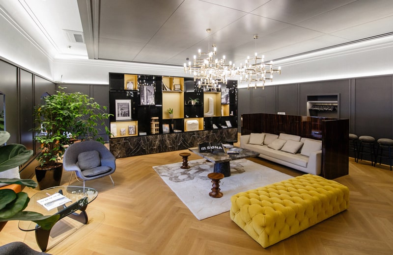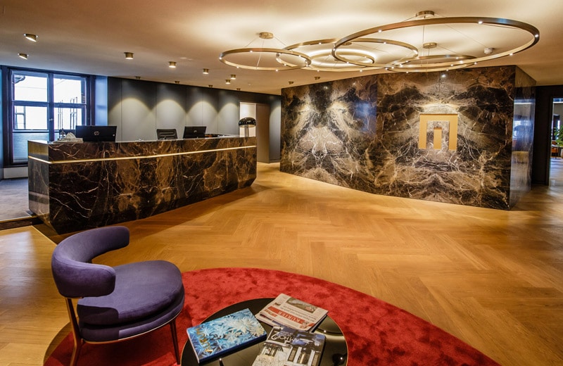 "Präsidententisch" und Salon mit Marmor-Raumteiler