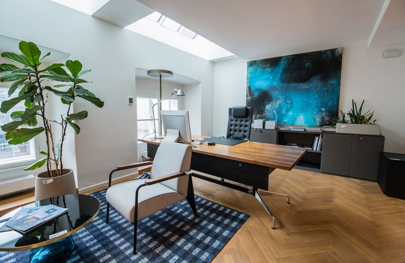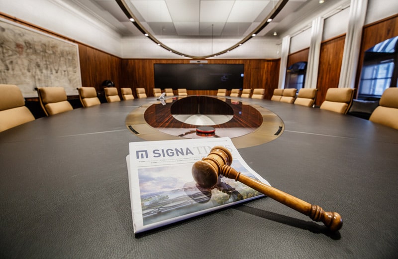 Das bei der Signa Holding vor der größten Pleite der österreichischen Wirtschaftsgeschichte einmal viel Geld da war, zeigt sich an der Ausstattung. Hochwertigste Materialien, qualitätsvolle Ausführung, Designerstücke und Tischlerhandwerk – die Einrichtung des Firmensitzes zeugt vom Premium-Anspruch des Immobilienkonzerns. Versteigert wird etwa die exklusive Ausstattung des Signa-Konferenzraums: Herzstück dort ist ein aufwändig ausgeführter, gelederter "Präsidententisch" mit einem Durchmesser von mehr als acht Metern und Platz für rund 20 Personen, eine genau darauf abgestimmte Design-Hängeleuchte sowie die passenden Design-Bürostühle aus Premium-Leder. Im dazugehörigen Salon sticht neben hochwertigen Ledersofas, Barhockern und Beistelltischen ein maßgefertigter Raumteiler in Marmorausführung ins Auge, dessen Neupreis bei rund 60.000 Euro lag. Und selbst am WC wurde mit Klopapierhaltern und Klobürstenhalter in Bronze-Optik Stil bewiesen.