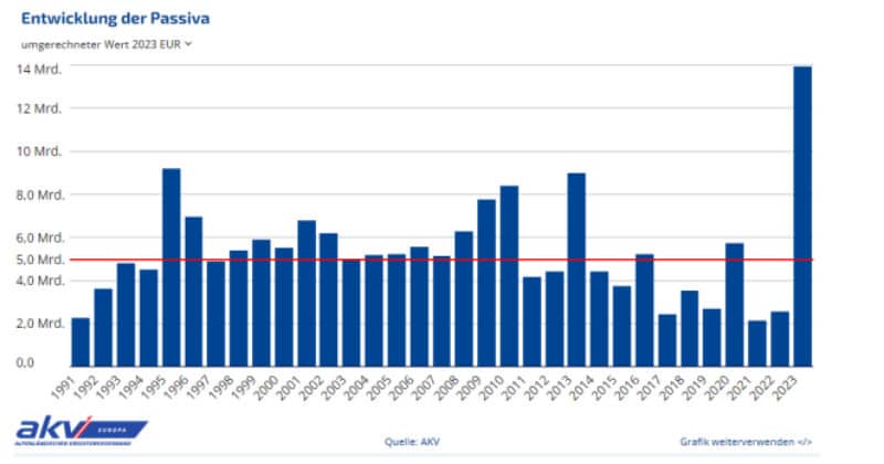 Um die Dimension zu verdeutlichen, hat der AKV die Gesamtpassiva aller Insolvenzen eines Jahres seit 1991 mit Hilfe des Währungsrechners der österreichischen Nationalbank, welcher vorwiegend auf den Verbrauchpreisindex abstellt, in heutige Werte umgerechnet und gegenübergestellt.