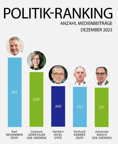 Herbert Kickl belegt unterdessen Rang 3 im aktuellen Politik-Ranking. Dem Chef der in Umfragen konstant in Führung liegenden FPÖ wurden im Dezember medial die Haltungen des politischen Mitbewerbs aufgezeigt. Während ÖVP-Vertreter:innen zahlreich eine Koalition mit Kickl an der Spitze ausschlossen, stellte Bundespräsident Alexander Van der Bellen (Platz 14) einen Regierungsauftrag an die FPÖ generell infrage. Vizekanzler Werner Kogler (Die Grünen), der für seine Rolle als Vizekanzler etwas abgeschlagen auf Platz 13 liegt, zeigte sich im Dezember etwa in einem Interview überzeugt: "Kommt Kickl, kommt Orbánistan" und ließ damit aufhorchen.