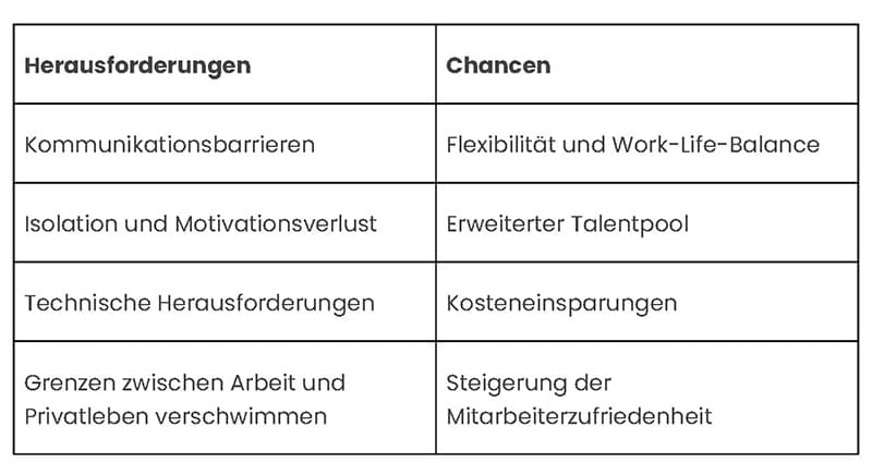 Die Einführung von Remote Leadership und Homeoffice bietet verschiedene Chancen für Unternehmer und Mitarbeiter. Die folgende Tabelle bietet einen Überblick über die Chancen sowie Herausforderungen: