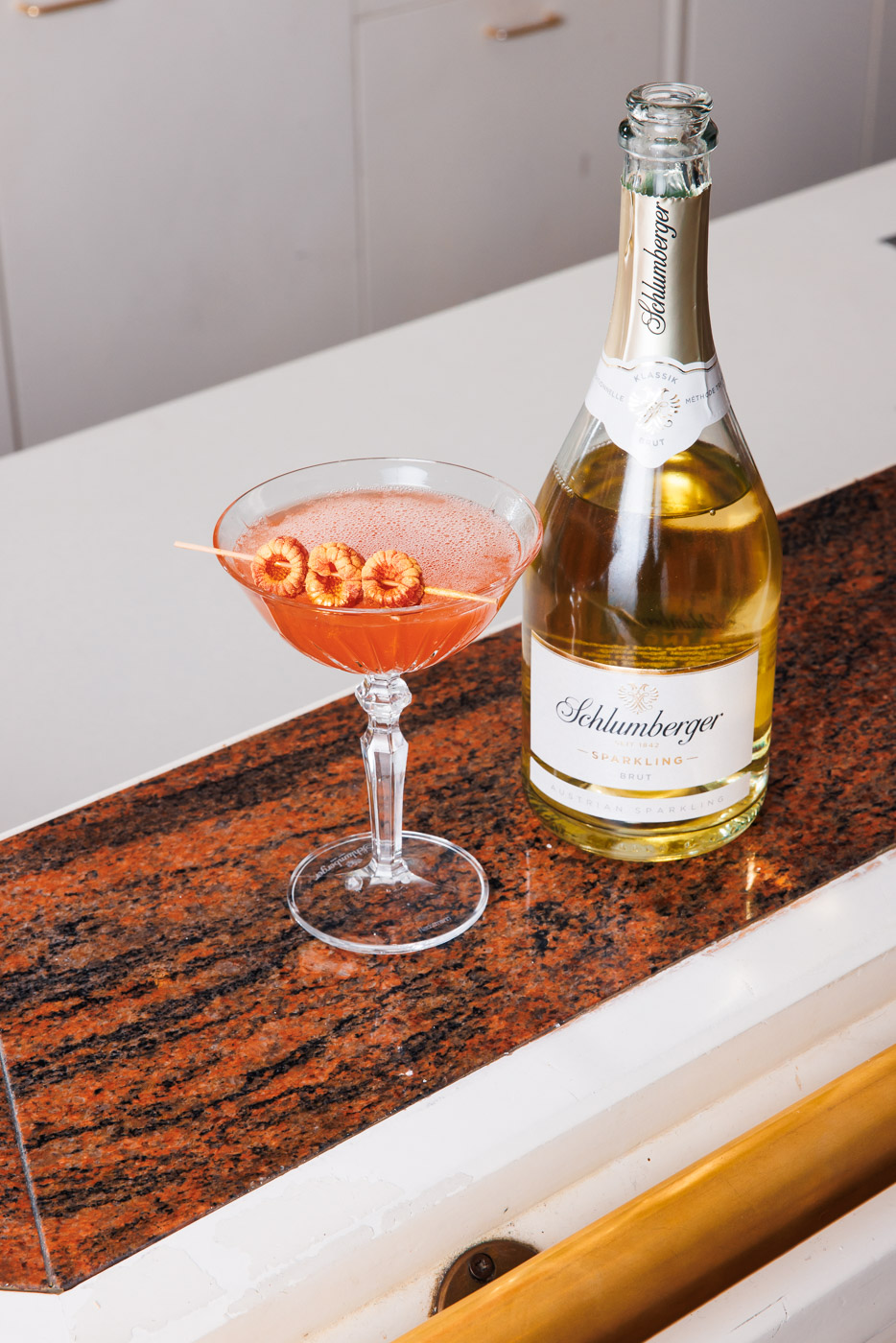 Pfirsichtsaft, Himbeerpüree und Vanillesirup in ein mit Eiswürfeln gefülltes Weißweinglas geben, gut verrühren und anschließend mit Schlumberger Sparkling Brut aufgießen.