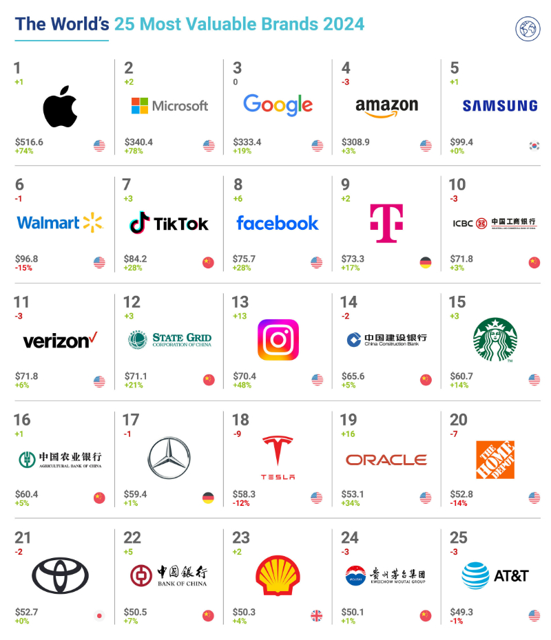 Vervollständigt werden die Top 10 durch Walmart (Platz 6), TikTok (Platz 7), Facebook auf Platz 8, Deutsche Telekom auf Platz 9 und ICBC auf Platz 10. Tesla (Markenwert um zwölf Prozent auf 58,3 Milliarden US-Dollar gesunken) ist aus den Top 10 herausgefallen und auf Platz 18 zurückgefallen. BYD (Markenwert um 20 Prozent auf 12,1 Milliarden US-Dollar gestiegen) hat Tesla nun überholt und ist nun der weltweit größte Hersteller von Elektrofahrzeugen.