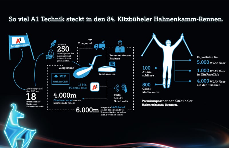 Grausam: Als Premiumpartner der Hahnenkammrennen sorgt A1 für eine reibungslose Kommunikation über 5G und das Glasfasernetz. Insgesamt werden von uns in Kitzbühel mehr als vier Kilometer Glasfaserkabel verlegt, die eine einwandfreie Kommunikation zwischen allen Bereichen sicherstellen. Im Vergleich zur Streif, die rund 3,3 Kilometer lang ist, haben wir also die Nase vorn (lacht).