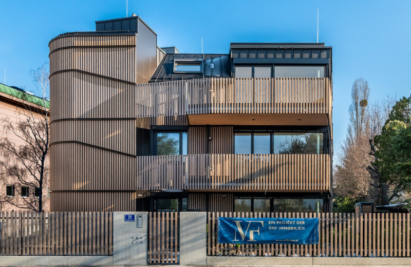 Das Wohnhaus mit Lärchenholzfassade hat fünf Wohneinheiten mit Wohnflächen von 50 bis 158 Quadratmetern. © VMF Immobilien