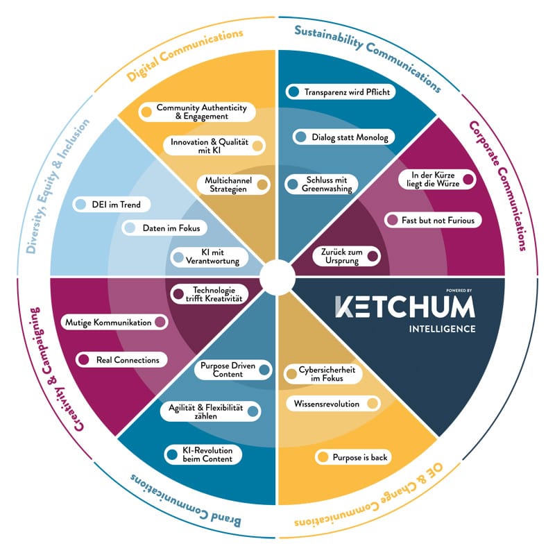 Die Kommunikationswelt befindet sich im steten Wandel. Auch 2024 dürfte wieder einige entscheidende Entwicklungen mit sich bringen. Wie dieses Aussehen könnten, soll der Trendradar von Ketchum Austria zeigen. Die Analyse beleuchtet Trends in der Kommunikation und hat das Ziel zu zeigen, worauf es 2024 in den Bereichen Digitale Kommunikation, Markenkommunikation, Unternehmenskommunikation, Organisationsentwicklung, Nachhaltigkeitskommunikation, DEI (Diversity, Equity and Inclusion) und Kreativität ankommen werde.
