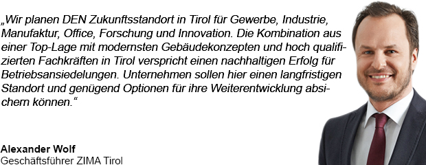 In Kematen bei Innsbruck in Tirol ist ein vielseitiger Wirtschaftspark für innovative Unternehmen geplant: „Wir planen DEN Zukunftsstandort in Tirol für Gewerbe, Industrie, Manufaktur, Office, Forschung und Innovation“, skizziert ZIMA Geschäftsführer Alexander Wolf die Ideen für das Areal. „Die Kombination aus einer Top-Lage mit modernsten Gebäudekonzepten und hoch qualifizierten Fachkräften in Tirol verspricht einen nachhaltigen Erfolg für Betriebsansiedelungen. Unternehmen sollen hier einen langfristigen Standort und genügend Optionen für ihre Weiterentwicklung absichern können“, so Wolf. Des Weiteren stehen Individualität und Flexibilität im Fokus sowie die perfekte Verkehrsanbindung und eine nachhaltige Energieversorgung.