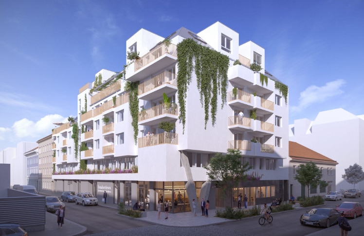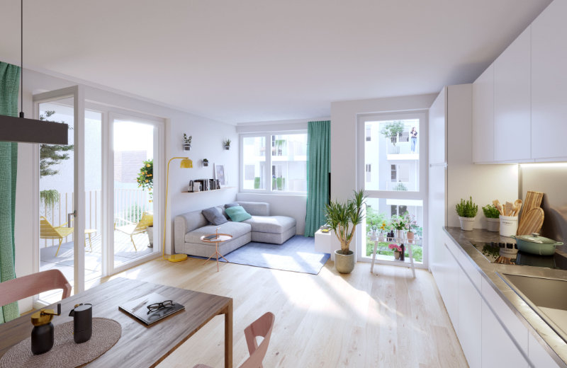 Auf sieben Etagen entstehen 75 Ein- bis Dreizimmerwohnungen in den Größen zwischen 30 und 70 Quadratmeter Wohnfläche. © Frame 9