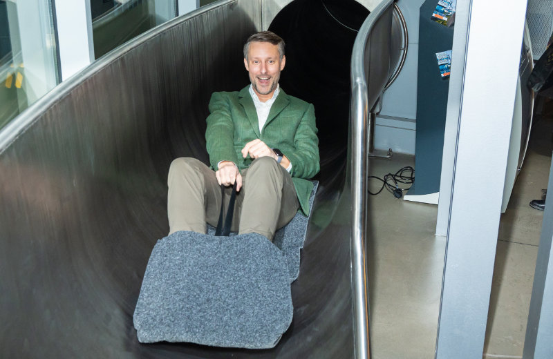 Als Location war diesmal der Donauturm ideal für die Immobilienbranche, ist es doch mit 252 Meter seit 60 Jahren immer noch das höchste Bauwerk Österreichs. Der General Manager des Donauturms, Hermann Krammer, erklärte den Gästen die Geschichte des Turms, der 1964 errichtet wurde, und beschrieb die aufwändige Montage des neuesten Highlights des Turms, der höchsten Rutsche Europas. Natürlich durften die 100 Immobilienprofis diese auch live testen und sind begeistert an der Außenfassade des Turms in die Tiefe gerutscht.