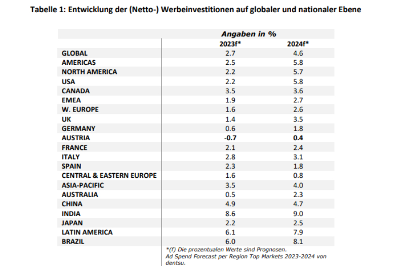 Tabelle 1: Entwicklung der (Netto-) Werbeinvestitionen auf globaler und nationaler Ebene © dentsu