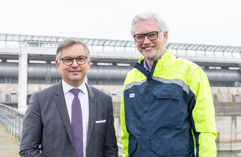 Finanzminister Magnus Brunner und Michael Strugl, Vorsitzender des Vorstands der Verbund AG, luden am Freitag zu einem Pressegespräch zum Thema "Investitionen in sichere, nachhaltige und leistbare Energieversorgung". Das Laufkraftwerk Wien-Freudenau erwies sich dabei als adäquate Location.