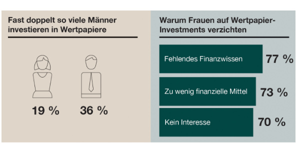 Der Analyse zufolge schätzen Frauen ihr vorhandenes Finanzwissen deutlich unausgeprägter ein als Männer. 77 Prozent der befragten Frauen gaben an, dass sie aufgrund von mangelndem Finanzwissen von einer Wertpapier-Veranlagung absehen. Zum Vergleich: Auch bei Männern gibt es Aus- und Fortbildungsbedarf, allerdings fällt der Anteil jener, die ihre Finanzkompetenz als unzureichend einschätzen, mit 61 Prozent geringer aus. Während 19 Prozent der Frauen Wertpapiere für den langfristigen Vermögensaufbau nutzen, tun dies mit 36 Prozent fast doppelt so viele Männer.
