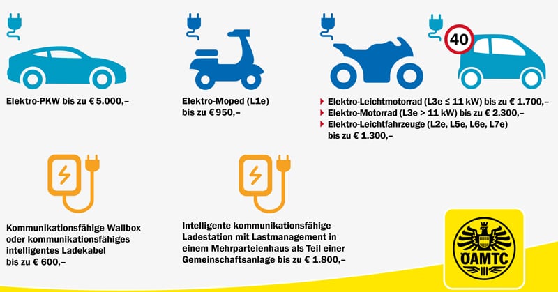 Prinzipiell bekommen Privatpersonen für den Kauf eines E-Autos bis zu 5.000 Euro, für ein E-Motorrad bis zu 2.300 Euro. Private Ladeinfrastruktur wird ebenfalls gefördert: Für Wallboxen und intelligente Ladekabel gibt es bis zu 600 Euro, Errichter von Gemeinschaftsanlagen in Mehrparteienhäusern erhalten bis zu 1.800 Euro.