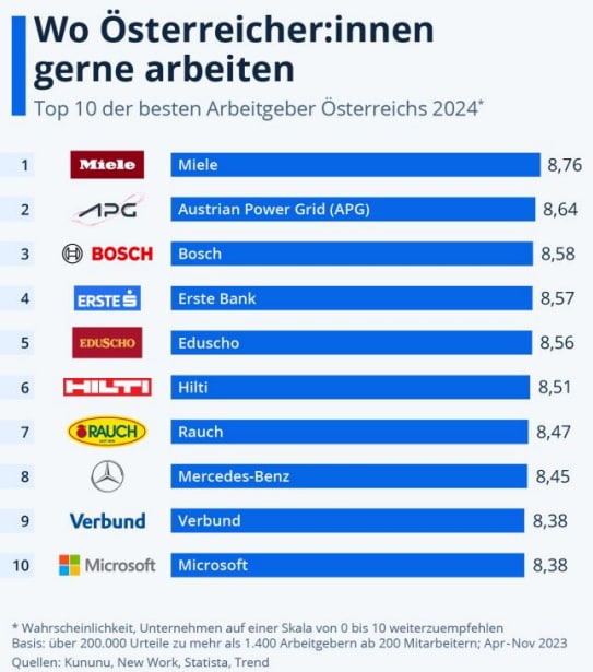Miele sichert sich dieses Jahr den Titel "Bester Arbeitgeber Österreichs" im Ranking der "300 besten Arbeitgeber Österreichs". Knapp dahinter belegt Austrian Power Grid (APG) den zweiten Platz, Bosch rundet mit Platz drei die Podestplätze ab. Vorjahressieger Mercedes-Benz landet heuer auf Platz 8. Vervollständigt werden die Top 10 von Erste Bank, Eduscho, Hilti, Rauch, Verbund und Microsoft.