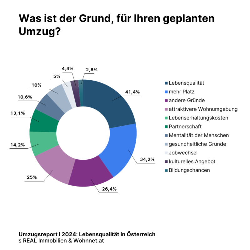 Auf das Land ziehen die Menschen aus Gründen wie der Lebensqualität und dem Wunsch nach mehr Platz. Für 5,3 Prozent waren die Lebenserhaltungskosten ein Grund das Bundesland zu verlassen. "Einer der Hauptgründe für einen Umzug ist Lebensqualität. Daraus resultiert eine Tendenz zur Stadtflucht, welche durch günstigere Lebenshaltungskosten weiter verstärkt wird", sagt Harald Schaumburger, Leitung Operations, wohnnet.at/Heise RegioConcept.